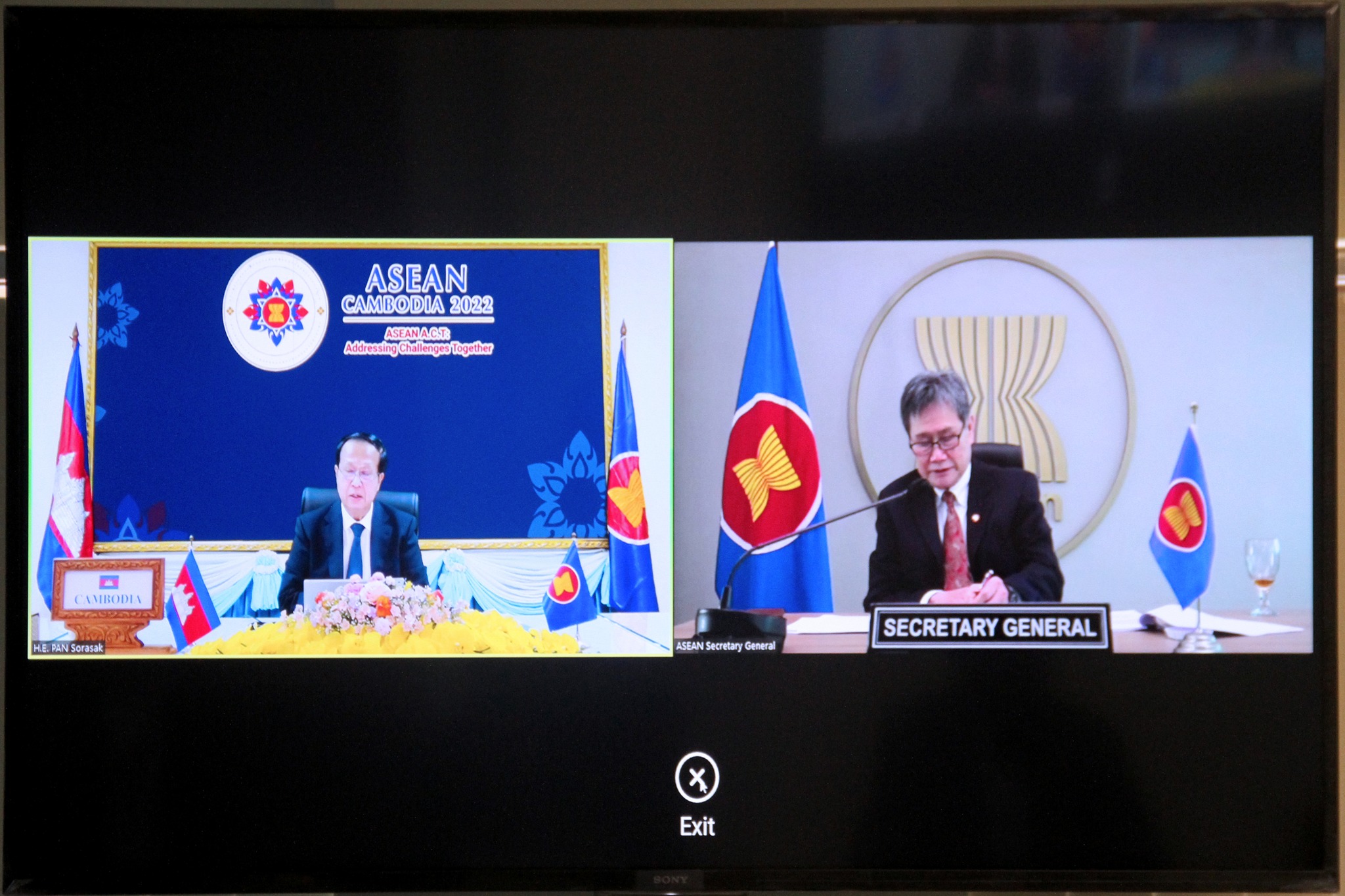មុនកិច្ចប្រជុំចង្អៀតមកដល់ លោក ប៉ាន សូរស័ក្ដិ រដ្ឋមន្រ្ដីក្រសួងពាណិជ្ជកម្ម និងជាប្រធាននៃកិច្ចប្រជុំរដ្ឋមន្រ្តីសេដ្ឋកិច្ចអាស៊ាន ទទួលជួបពិភាក្សាការងារជាមួយឯកឧត្តម Lim Jock Hoi អគ្គលេខាធិការអាស៊ាន តាមប្រព័ន្ធវីដេអូ ដើម្បីពិភាក្សាលើកិច្ចការមួយចំនួន នៅថ្ងៃទី១១ ខែមីនា ឆ្នាំ២០២២។